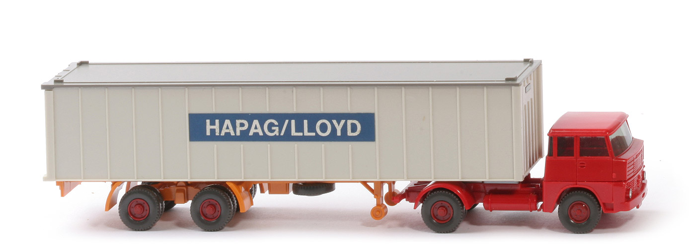 | Zugmaschine | Kabine oben | rot | Kabine unten | rot | Verglasung | getönt | Chassistyp | alt | Zughaken | ohne | Fläche hinter Sattelpfanne | 3 Stege | Chassisfarbe | rot | Sattelpfanne | für großen Königsbolzen | Reserverad | ohne | Räder | 12mm, Profil grob | Felgen | hellbraunrot | | Container | Art | 1 x 40 ft, gerippt | Dach | betongrau | Korpus | perlweiß | Türen | perlweiß | Unterkante | schmal | Beschriftung | Hapag-Lloyd (s. Foto) | Beschriftung Grösse | 7 Felder, Papieraufkleber | | Auflieger | Farbe | gelborange (Werbe) | Unterfahrschutz | ohne | Königsbolzen | stark | Räder | 12mm, Profil grob | Felgen | hellbraunrot |