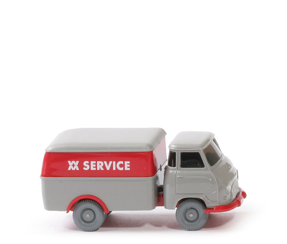 Kabine | ca. platingrau | Verglasung | stark getönt | Bedruckung Scheinwerfer | silbern | Bedruckung Grill | silbern | Inneneinrichtung | ohne | Chassis | dunkles rot | Bodenprägung | neues WIKING-Logo, Germany | Kofferdach | ca. platingrau | Koffer oben | dunkles rot | Koffer unten | ca. platingrau | Bedruckung Rückleuchten | ohne | Bedruckung Kennzeichen hinten | ohne | Bedruckung Koffer oben | WM Service | Bedruckung Koffer unten | ohne | Räder | 9 mm, glatt, ca. staubgrau | Ladegut | ohne |