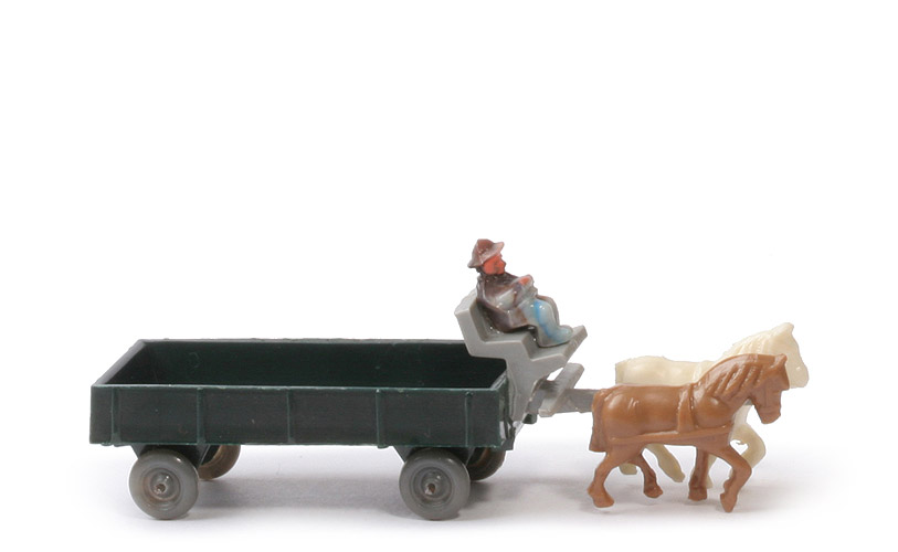 Räder | Drahtachser | Pritschentyp | ohne Querverbretterung | Farbe Pritsche | schwarzgrün | Deichselrest | mit | Pritschenboden | mit Struktur | Zughaken | integriert, nach unten | Deichsel/Kutschbock | silbern | Quersteg Deichsel | mit | Farbe linkes Pferd | hellelfenbein | Farbe rechtes Pferd | ockerbraun | Kutscher Typ | Hut | Kutscher Farbe | mischfarbend (braun - grau - blau) | Kutscher Bemalung | Gesicht, Hände | Räder | glasig staubgrau |