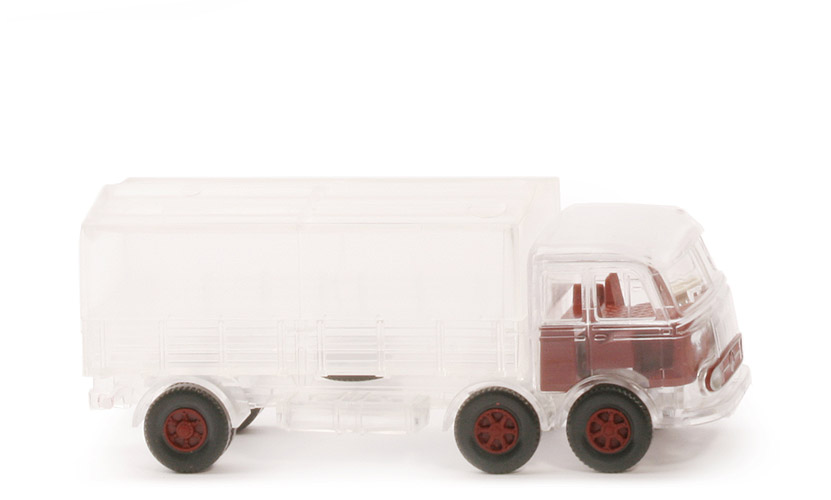 Fahrerhaus | klar transparent, Innenprägung "3" | Bedruckung Fahrerhaus | ohne | Grill | eingesetzt, ca. rotbraun | Bedruckung Grill | Grillumrandung, Stern, Scheinwerfer, Zierlinie silbern | Verglasung | klar | Inneneinrichtung | ca. rotbraun | Lenkrad | separat eingesetzt, ca. cremeweiß | Doppelkotflügel vorne | klar transparent | hier Bedruckung | ohne | Chassis, Kardaneinsatz | klar transparent | Bodenprägung | neues Wiking-Logo | Kotflügel hinten | klar transparent | Zughaken | stark | Pritsche | klar transparent | Pritscheneinlage | ohne | Plane | klar transparent, hinten offen | Räder | 12 mm, Felgen eingesetzt | Felgen | 8-Loch,ca. rotbraun |