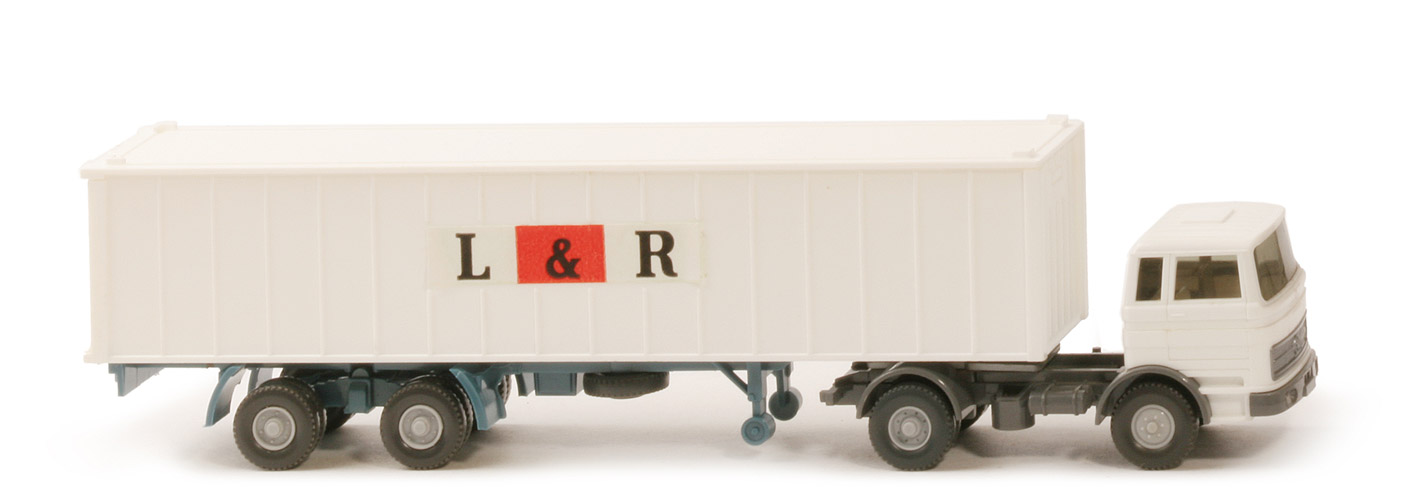 | Zugmaschine | Kabine oben | weiß | Kabine unten | weiß | Streifen | ohne | Verglasung | getönt | Inneneinrichtung | ca. hellgelbgrau | Lenkrad | ohne | Grill | silbern | Stoßstange, Radlauf vorn | basaltgrau | Chassistyp | neu | Chassisfarbe | basaltgrau | Radlauf hinten | basaltgrau | Reserverad | unter Chassis | Sattelpfanne | für großen Königsbolzen | Räder | 12mm, Profil grob | Felgen | silbergrau | | Container | Art | 1 x 40 ft gerippt | Dach | weiß | Korpus | weiß | Türen | weiß | Unterkante | breit | Beschriftung | L & R (s. Foto) | Beschriftung Grösse | 5 Felder, Papieraufkleber | | Auflieger | Farbe | diamantblau | Unterfahrschutz | ohne | Königsbolzen | stark | Räder | 12mm, Profil grob | Felgen | silbergrau |