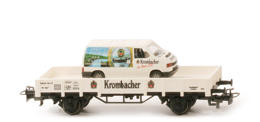 Märklin 4424.018 AC H0 Niederbordwagen „Krombacher“ als Märklin Sonder-Set für Krombacher mit VW Transporter. Das VW Modell entspricht dem Modell nach GK Krombacher (7). Weder im GK noch im Steinmann noch in der WIKING-Datenbank gelistet. Auf dem Märklin-Karton findet sich noch die Nummer 605907. |