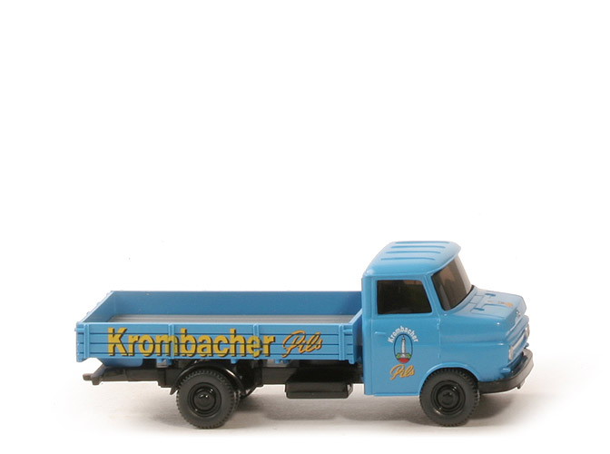 Kabine | lichtblau (!) | Haube | gerade | Dach | mit 4 Längsstreben | Verglasung | stark getönt | Inneneinrichtung | ohne | Bedruckung vorne | Scheinwerfer, Zierlinie, Opel-Emblem silber | Bedruckung Kennzeichen | ohne | Chassis Farbe | schwarz | Chassis Bodenprägung | neues Wiking-Logo | Kotflügel hinten | schwarz | Pritsche Farbe | lichtblau (!) | Pritscheneinlage | silbern | Plane | ohne | Räder | 9 mm, 2-teilig, Radkappen schwarz | | weitere Bedruckung | Haube | "Krombacher Pils", Logo | Türen | "Krombacher Pils", Logo | Pritsche | "Krombacher Pils" |