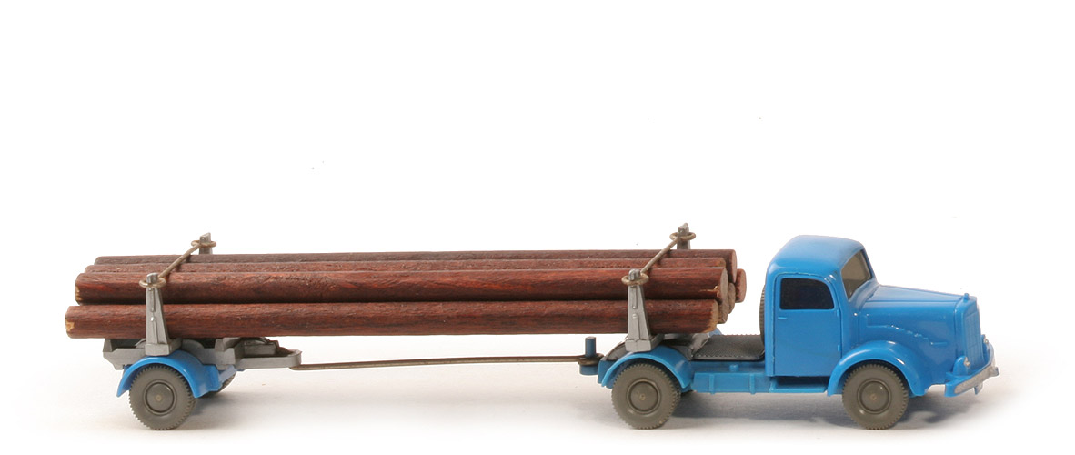 | Zugmaschine | Farbe Kabine | himmelblau | Version Kabine | mit Schlitz hinter Nrn-Schild | Farbe Chassis | himmelblau | Bemalung | Scheinwerfer, Stoßstange | Sattelpfanne | alt, ohne Steg, für kleinen KöBo | Chassis | Version 2 | Achshalterungen | geschlossen | Bodenprägung | WM ohne Kreis | Reserverad | hinter Kabine | Räder | 10mm, neuere Ausführung | | Auflieger | Deichsel | Metall | Rungen | silber | Radlauf | himmelblau | Achshalterungen | offen | Königszapfen | dünn, an vorderer Runge | Rückleuchten | unbemalt | Ladung | 7 Rundhölzer, dunkel | Sicherung | Metallbügel | Räder | 10mm, neuere Ausführung |