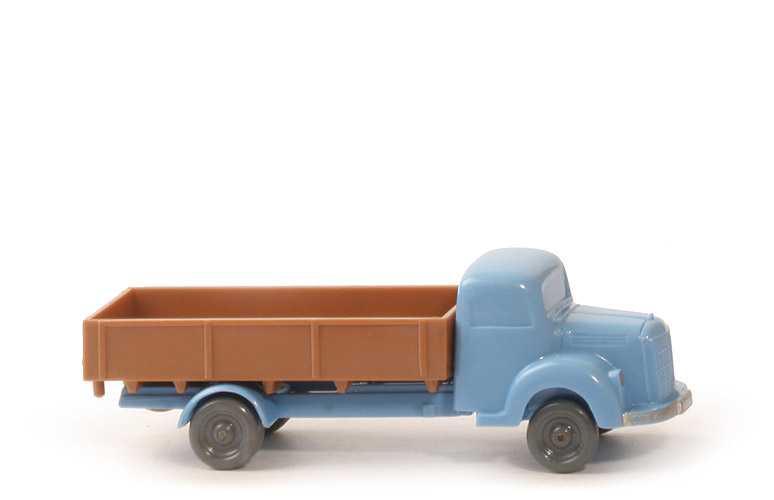 Achsen | Rollachser | Farbe Kabine u. Chassis | lilablau | Kabinenboden | offen, Bodenprägung WM im Kreis | Bemalung Kabine | Scheinwerfer, Stoßstange | Pritsche | Seiten glatt | Farbe Pritsche | ockerbraun | Zughaken | nach unten | Zapfen | Rundzapfen | Befestigung Pritsche | gesteckt | Räder | 10mm, ohne Profil dunkelbasaltgrau |