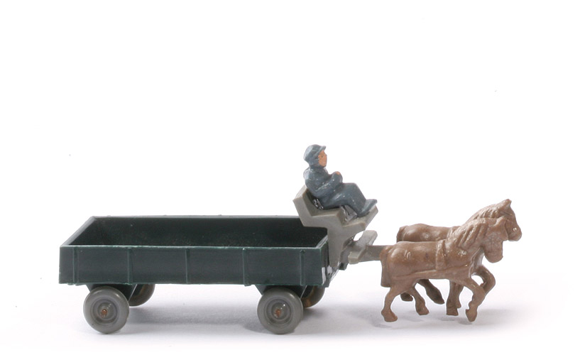 Räder | Drahtachser | Pritschentyp | ohne Querverbretterung | Farbe Pritsche | schwarzgrün | Deichselrest | mit | Pritschenboden | mit Struktur | Zughaken | integriert, nach unten | Deichsel/Kutschbock | ca. platingrau | Quersteg Deichsel | mit | Farbe linkes Pferd | ca. blassbraun | Farbe rechtes Pferd | ca. blassbraun | Kutscher Typ | Mütze | Kutscher Farbe | ca. hellazurblau uni | Kutscher Bemalung | Gesicht, Hände | Räder | ca. staubgrau |