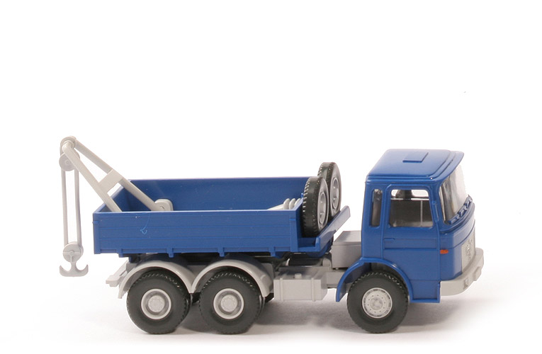 Das Modell passt zum Blumhardt-Serien-Set von WIKING aus dem Jahr 2017. Die kurze MAN F8 Kabine hat hier erstmals ein Dreiachsfahrgestell. Die Pritsche mit der Abschlepp-Vorrichtung kommt ursprünglich vom Volvo N 10 aus 1985.