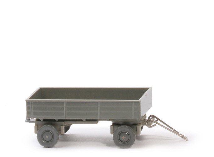 | Pritsche | Pritsche Farbe | betongrau | Pritschenseiten | mit Struktur | Pritscheneinlage | ohne | Kennzeichen hinten | zweiteilig | | Chassis | Chassis Variante | Typ 2 | Chassis Farbe | hellolivgrau | Achshalterungen | offen | Drehschemel | eingesteckt | Bodenprägung Drehschemel | WM | Bodenprägung Chassis | ohne | Zughaken | silbern, Typ LKW, unter Chassis geklebt | | weitere Details | Deichsel | Metall | Bemalung Rückleuchten | ohne | Bemalung Kennzeichen | ohne | Räder | 10 mm, staubgrau, neuere Ausführung |