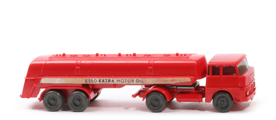 | Zugmaschine | Kabine oben | rot | Kabine unten | rot | Verglasung | getönt | Stege für Inneneinrichtung | ja | Chassistyp | neu | Zughaken | ohne | Fläche hinter Sattelpfanne | 3 Stege | Chassisfarbe | rot | Sattelpfanne | für großen Königsbolzen | Reserverad | unter Chassis gesteckt | Räder | 12 mm, einteilig, anthrazit | | Felgen | | Auflieger | Farbe Korpus, Unterteil | rot | Farbe Achseinheit | rot | Typ Achseinheit | Germany/Wiking | Königsbolzen | stark | Reserverad | ohne | Beschriftung Seite | Esso EXTRA ... (s. Foto) | Schriftfarbe Seite | schwarz | Beschriftung Heck | Esso Logo | Räder | 12 mm, einteilig, anthrazit |