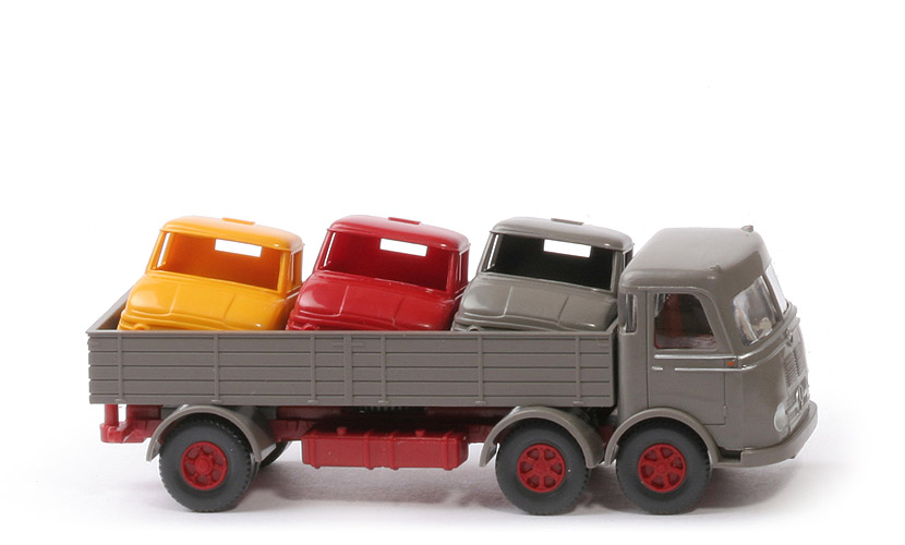 Als Ladung dienen drei Kabinen zum Unimog 406 in den offiziellen Farbbezeichnungen "quarzgrau", "purpurrot" und "narzissengelb" (nicht in der Wanner-Karte). |