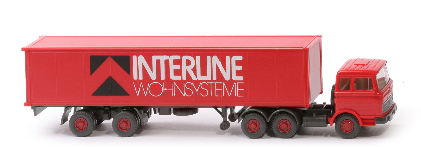 | Zugmaschine | Typ | Dach querversteift | Kabine | rot | Außenspiegel | mit - links und rechts | Scheibenwischer | ohne | Lenkrad | mit | Inneneinrichtung | ca. rotelfenbein | Stoßstange | anthrazit, Scheinwerfer ungesilbert | Chassis | anthrazit, mit Zentriernippel | Radlauf hinten | zweiteilig, anthrazit | Reserverad | hinter Kabine | Räder | Profil grob | Felgen | hellbraunrot | | Container | Art | 40 ft Glattwand | Farbe | rot | Türen | alt | Beschriftung | Interline (s. Foto) | Beschriftung Art | Druck schwarz und weiß | Befestigung Container | verklebt | | Auflieger | Farbe | anthrazit | Unterfahrschutz | ohne | Königsbolzen | stark | Räder | Profil grob | Felgen | hellbraunrot |