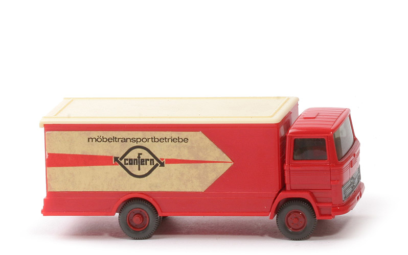 | Farbe Kabine | rot | | Spiegel | ohne | | Verglasung | getönt | | Grill | silbern eingesetzt | | Bemalung vorne | ohne | | Inneneinrichtung | 2 Sitze, Motorblock | | Armaturenbrett, Lenkrad | ohne | | Farbe Innenrichtung | ca. hellgelbgrau | | Chassis Farbe | hellbraunrot | | Chassis Bodenprägung | GERMANY, WM | | Zughaken | ohne, entfernt | | Reserverad | hinten unter Chassis gesteckt | | Bemalung Rückleuchten | ohne | | Aufbau Typ | flacher Koffer | | Farbe Koffer | dieses glasige rot | | Farbe Türen | creme | | Farbe Kofferdach | creme | | Koffer Bodenprägung | ohne | | Beschriftung | confern ... (siehe Foto) | | Beschriftung Art | Papieraufkleber | | Dachbeschriftung | ohne | | Räder | 11 mm, Felgen eingesetzt | | Farbe Felgen | hellbraunrot |