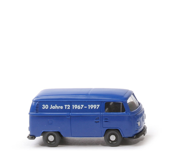Karosserie | dunkles maritimblau | Türgriffe | erhaben | Verglasung | klar | Lenkrad | anthrazit | Inneneinrichtung | ca. basaltgrau | Bemalung Scheinwerfer | silbern | Bemalung VW-Enblem | weiß | Bemalung Rückleuchten | ohne | Bedruckung | "30 Jahre T2 1967 - 1997", weiß | Chassisfarbe | schwarz | Bodenprägung | Wiking Germany (altes Logo) | Räder Typ | 8 mm, Nabe flach, Profil fein | Radkappen | gesilbert |
