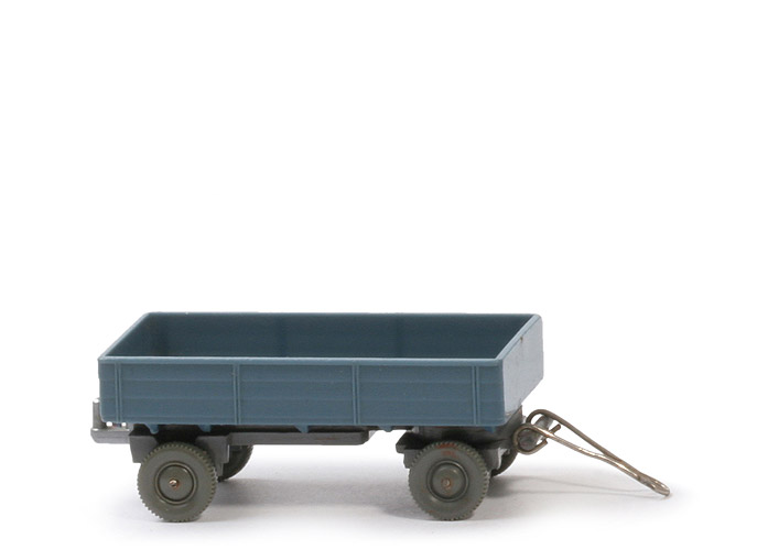 | | Pritsche | | Pritsche Farbe | mattgraublau | | Pritschenseiten | Struktur | | Pritscheneinlage | ohne | | Kennzeichen hinten | zweiteilig | | | Chassis | | Chassis Farbe | basaltgrau | | Chassis Variante | Typ 1 | | Achshalterungen | geschlossen | | Drehschemel | vernietet | | Bodenprägung Drehschemel | ohne | | Bodenprägung Chassis | ohne | | Zughaken | silbern, eingesetzt in Chassisschlitz | | | weitere Details | | Deichsel | Metall | | Bemalung Rückleuchten | rot | | Bemalung Kennzeichen | silbern | | Räder | 10 mm, mit Profil, neuerer Typ |