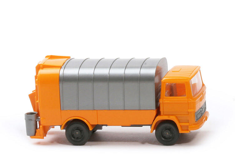 | Kabine | glasiges orangegelb | | Spiegel | ohne | | Grill | silbern mit Stern | | Verglasung | klar | | Inneneinrichtung | ca. lichtgrau | | Lenkrad | ohne | | Chassis | staubgrau | | Druckluftbehälter | Hahn breit | | Radlauf hinten | glasiges orangegelb | | Trommel | silbern | | Trommelunterbau | orangegelb | | hier Bodenprägung | 64n | | Heckteil des Aufbaus | orangegelb | | Prägung "KUKA" | mit | | Rückleuchten | erhaben | | Aussparung vor Trittbrett | ohne | | Mülltonnen | 2 gesteckt, silbern | | Beschriftung | ohne | | Bemalung | ohne | | Räder | 11 mm, 6 Loch |