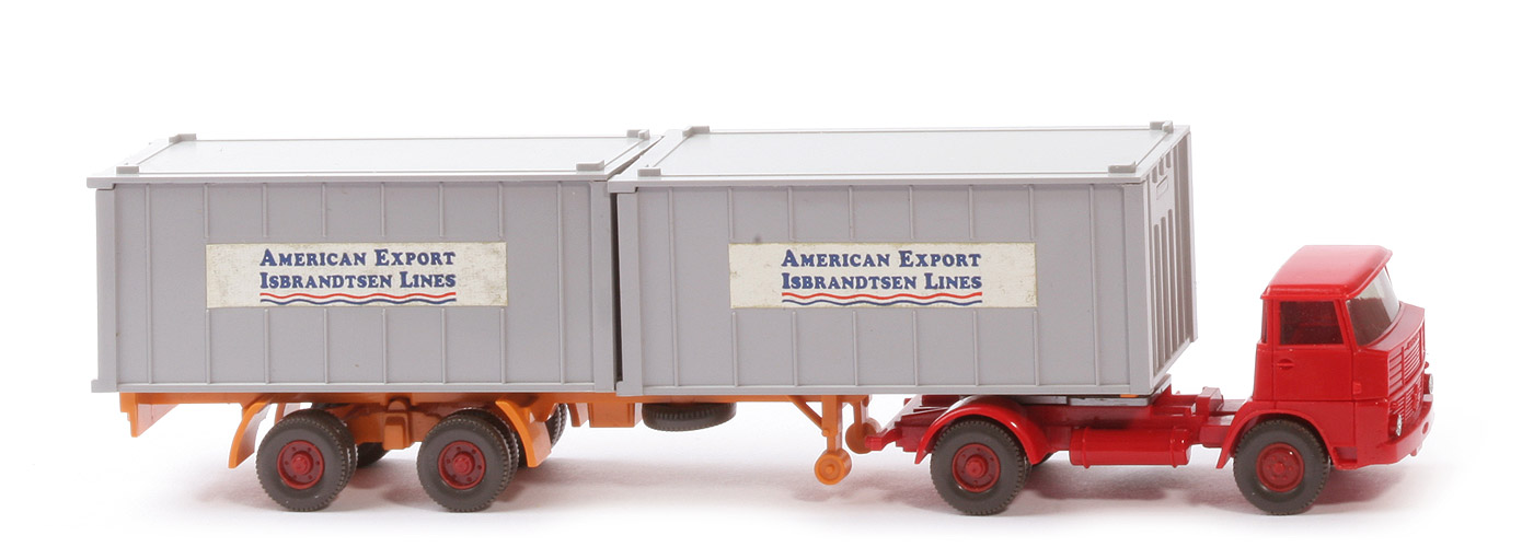 | Zugmaschine | Kabine oben | rot | Kabine unten | rot | Verglasung | getönt | Chassistyp | neu | Zughaken | ohne | Fläche hinter Sattelpfanne | 3 Stege | Chassisfarbe | rot | Sattelpfanne | neu, für dünnen Bolzen | Reserverad | ohne | Räder | 12 mm, Profil fein | Felgen | hellbraunrot | | Container | Art | 2 x 20 ft, gerippt | Dach | silbergrau | Korpus | silbergrau | Türen | silbergrau | Beschriftung | American Export ... (s. Foto) | Beschriftung Größe | 5 Felder, Papieraufkleber | | Auflieger | Farbe | gelborange (Werbe) | Unterfahrschutz | ohne | Königsbolzen | dünn | Räder | 12 mm, Profil fein | Felgen | hellbraunrot |