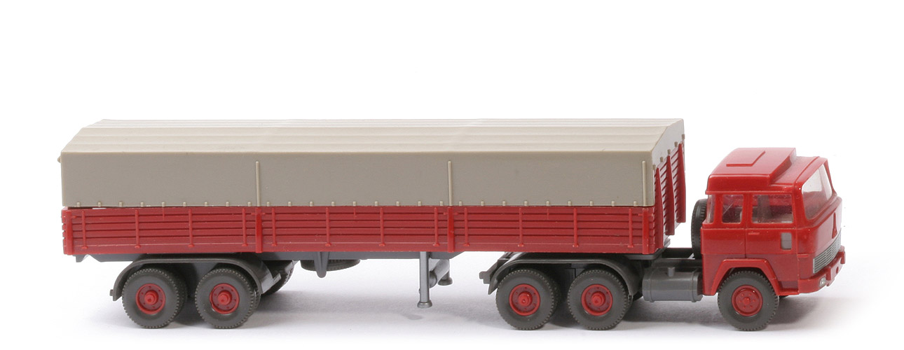 | Zugmaschine | Kabine oben | hellbraunrot | Kabine unten | hellbraunrot | Verglasung | klar | Inneneinrichtung | ca. perlweiß | Lenkrad | ohne | Grill | silber | Chassis | basaltgrau | Radlauf hinten | anthrazit, 1-teilig | Sattelpfanne | für den dünnen Königszapfen | Reserverad | hinter Kabine | Räder | Profil fein | Felgen | hellbraunrot | | Auflieger | Farbe Pritsche | hellbraunrot | Pritschentyp | Holzpritsche ohne Lasche | Chassis | basaltgrau | Königsbolzen | integriert | Pritscheneinlage | silbern | Typ Achseinheit | Made in Germany 2c | Doppelachsaggregat Farbe | anthrazit | Bodenprägung Achseinheit | Made in Germany | Reserverad | ja, ohne Felge | Stütze | starr, silbern, Hydraulikstempel | Plane | olivgrau | Plane Art | Seite 3 Mark., vorne offen | Beschriftung | ohne | Räder | Profil fein | Felgen | hellbraunrot |
