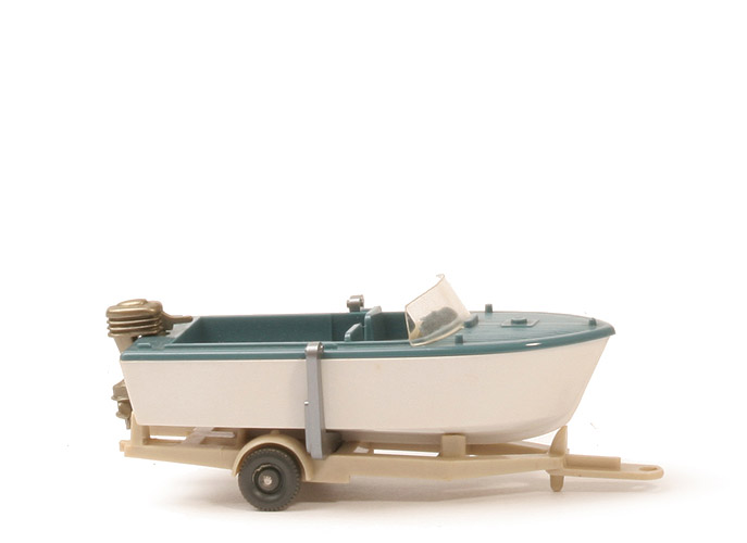 | Boot | Bootoberseite | diamantblau | Vordersitze | mit Verbindungssteg ohne Nippel | Windschutzscheibe | flach (ca. 6 mm hoch) | Lenkrad | ca. hellelfenbein, 3-speichig | Fußraum (Deck) | silbern | hier Prägung | WM | Außenborder | goldmetallic | Rumpf | (grau-) weiß | | Anhänger | Farbe | ca. hellelfenbein | Version | Typ 2 (mit Schlitz für Kunststoffhalterung) | Nestkennung | "2" | Bodenprägung | Wiking Germany | Befestigung Boot | per Kunststoffhalterung - silbern | Räder | anthrazit, Nabe glatt |