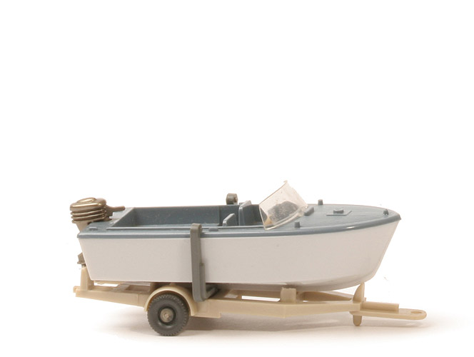 | Boot | Bootoberseite | graublau | Vordersitze | mit Verbindungssteg mit Nippel | Windschutzscheibe | flach (ca. 6 mm hoch) | Lenkrad | ca. hellelfenbein, 3-speichig | Fußraum (Deck) | silbern | hier Prägung | WM | Außenborder | goldmetallic | Rumpf | altweiß | | Anhänger | Farbe | ca. hellelfenbein | Version | Typ 2 (mit Schlitz für Kunststoffhalterung) | Nestkennung | "1" | Bodenprägung | Wiking Germany | Befestigung Boot | per Kunststoffhalterung - basaltgrau | Räder | anthrazit, Nabe glatt |
