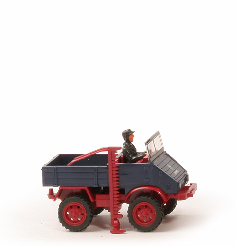 Das Befestigung des Mähwerks ist unter das Verteilergetriebe geklebt. Es lässt sich auf Bodenniveau herunter schwenken. Schön gemacht! |