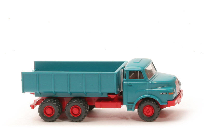 Farbe Kabine | blautürkis | Verglasung | klar | Inneneinrichtung | ca. hellbraunrot, Lkr integriert | Grill Ausführung | Druck rot, Rand, Logo silbern | hier Beschriftung | MAN, Büssing-Logo (Löwe) | Bemalung | Scheinwerfer silbern | Chassis | rot | Kardanelement | rot | Bodenprägung | neues WIKING-Logo, Germany | Reserverad | ohne | Schüttmulde | blautürkis | Schüttmuldenträger | rot | Pritscheneinlage | blautürkis | Räder | 12 mm, Profil grob, Felge eingesetzt | Felgen | neue Felgen, rot |
