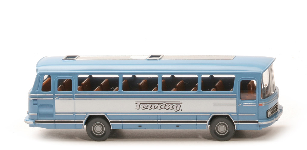 Hübsches Serienmodell - sehr liebevoll bedruckt. Gesilbert sind z.B. Zierlinien, Türgriffe, Mittel- strebe Frontscheibe, Scheibenwischer, Mercedes-Sterne etc. Blinker vorne orange, Rückleuchten rot. Seitlich unten schwarz abgesetzt. Druck "Touring" silbern/schwarz auf weißer Fläche.