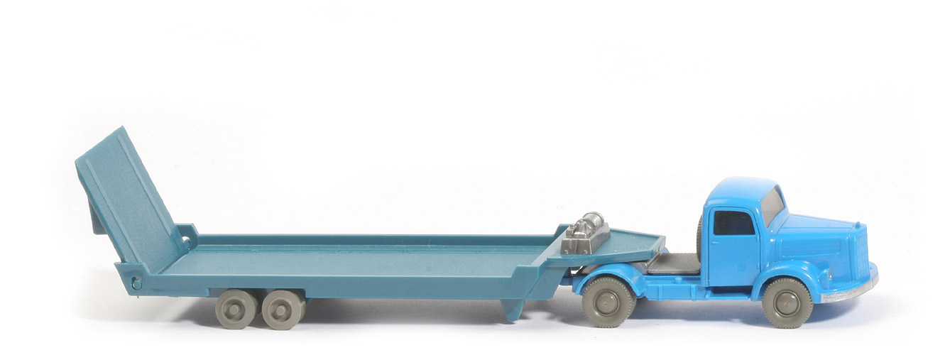 | Zugmaschine | Farbe Kabine | himmelblau | Version Kabine | mit Schlitz hinter Nrn-Schild | Farbe Chassis | himmelblau | Bemalung | Scheinwerfer, Stoßstange | Sattelpfanne | alt, ohne Steg, für kleinen KöBo | Chassis | Version 2 | Achshalterungen | geschlossen | Bodenprägung | WM (ohne Kreis) | Reserverad | hinter Kabine | Räder | 10mm, neuere Ausführung | | Auflieger | Typ | vorn eckig (Typ B) | Seilwinde | mit | Knopf vor Seilwinde | nein | Rückleuchten | ohne | Stützen | mit | Bodenprägung | WM/Wiking/Made in Germany | Farbe | azurblau | Räder | glatt |