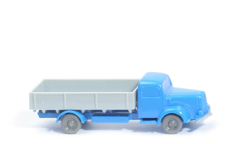 Achsen | Rollachser | Farbe Kabine u. Chassis | himmelblau | Verstärkung Trittbretter | ohne | Bemalung Kabine | Scheinwerfer, Stoßstange | Version Chassis | Version 1a | Chassis Farbe | himmelblau | Bodenprägung | WM im Kreis | Pritsche | Seiten glatt | Farbe Pritsche | grau | Zughaken | nach unten | Zapfen | Rundzapfen | Kennzeichen | bemalt silbern | Befestigung Pritsche | geklebt | Räder | 10mm, ohne Profil |