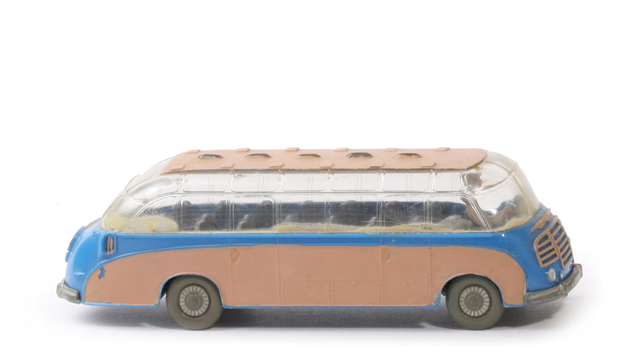 Karosserie Typ | Serie | Karosserie Farbe | himmelblau | Schlitze für Dach | lang und breit | Armaturenbrett | trapezförmig | Gestaltung Zierline Front | mit Punkt, gesilbert | Boden Fahrgastraum | glatt | Gestaltung Seite | Schablonierung an sich silber - hier nachgemalt | Fahrersitz Farbe | basaltgrau | Sitzreihen | basaltgrau, gesteckt | Fahrer Typ | groß, mit Mütze | Fahrer Farbe | mischgrau | Lenkrad Typ | groß, zwei Speichen | Lenkrad Farbe | basaltgrau | Dach Befestigung | recht übel verklebt | Dach Gestaltung oben | glatt, bemalt | Dach Typ Haltenasen | lang und breit | Chassis Farbe | basaltgrau | Chassis Typ | Typ 2 | Achshalterungen hierbei | geschlossen | Bodenprägung hierbei | WM im Kreis | Bemalung Hauptscheinwerfer | silber | Bemalung Nebelscheinwerfer | silber | Bemalung Grill und Zierlinie | silber | Bemalung Stoßstangen | silber | Bemalung Rückleuchten | rot | Bemalung Blinker hinten | rot | Bemalung Kennzeichen hinten | silber | Bemalung 3 Zierlinien hinten | silber | Bemalung Lüfter | in Dach und Seitenfarbe bemalt | Räder Typ | Trilex Bus, mit Profil | Räder Ausführung | staubgrau, Felgen gesilbert |