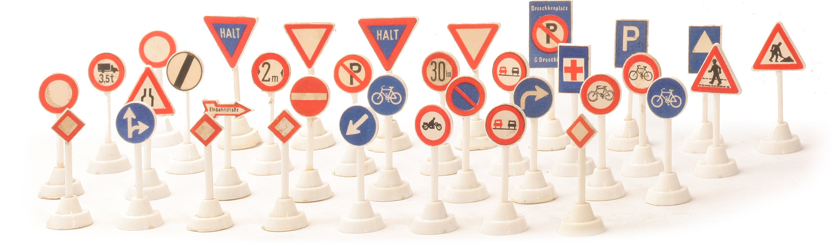 Dieses Verkehrsschilder-Set beinhaltet die Schilder, die auf den WIKING-Straßenplan I aufgedruckt sind. Ein solches Set gab es von 1957 bis 1970. Anfangs gab es Schilder mit flachem Sockel in anderem Karton. Unten Bilder vom letzten Verkaufsskarton ("großer Karton" - 1960 bis 1970).