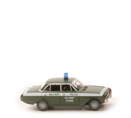 Wunderbar bedruckt: Umlaufendes weißes Band mit Negativdruck "Military Police", Türen mit 2US Army, 10 5008", Scheibenwischer, Türrahmen, Türgriffe und Türschlösser, Grill, Heckblende, Stoßstangen silbern. Offiziell ist die Farbe "olivgrün", was nichts mit der gleichnamigen Wanner-Farbe zu tun hat. |