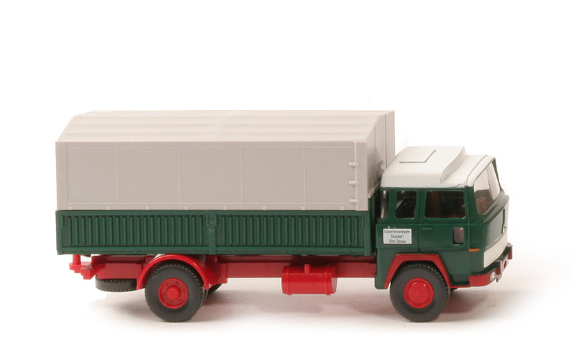 | Kabine oben | ca. kieferngrün | | Dach Kabine | weiß schabloniert | | Kabine unten | ca. kieferngrün | | Verglasung | klar | | Inneneinrichtung | ca. ockerbraun | | Lenkrad | integriert | | Grill | weiß | | Chassis Farbe | rot | | Radlauf hinten | rot | | Bodenprägung | neues WIKING-Logo | | Reserverad | hinten unter Chassis | | Pritsche | Stahlpritsche, ca. kieferngrün | | Pritscheneinlage | ca. kieferngrün | | Plane | hoch, hinten geschlossen | | Farbe Plane | ca. lichtgrau | | Räder | 12mm, Profil grob | | Felgen | 6-Loch, rot |