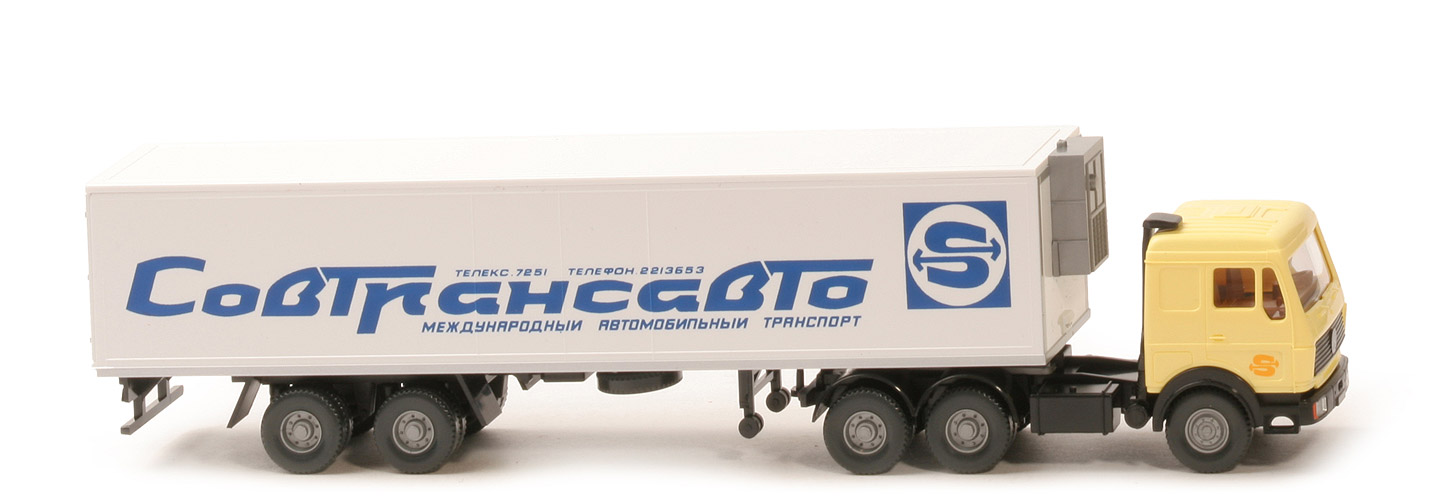 Collect & Invest (53): "Ein Mercedes-Benz Kühlsattelzug der russischen Spedition Sovtransavto." Schön bedruckt: Stoßstange mit Nationalitätskennzeichen "SU", Scheinwerfer silbern, Blinker orange. Kabinentüren mit S-Logo. Rückleuchten der Zugmaschine und des Aufliegers rot. Kofferfront und -heck mit silbener Umrahmung, Kofferseiten unten mit silbernem Streifen. |