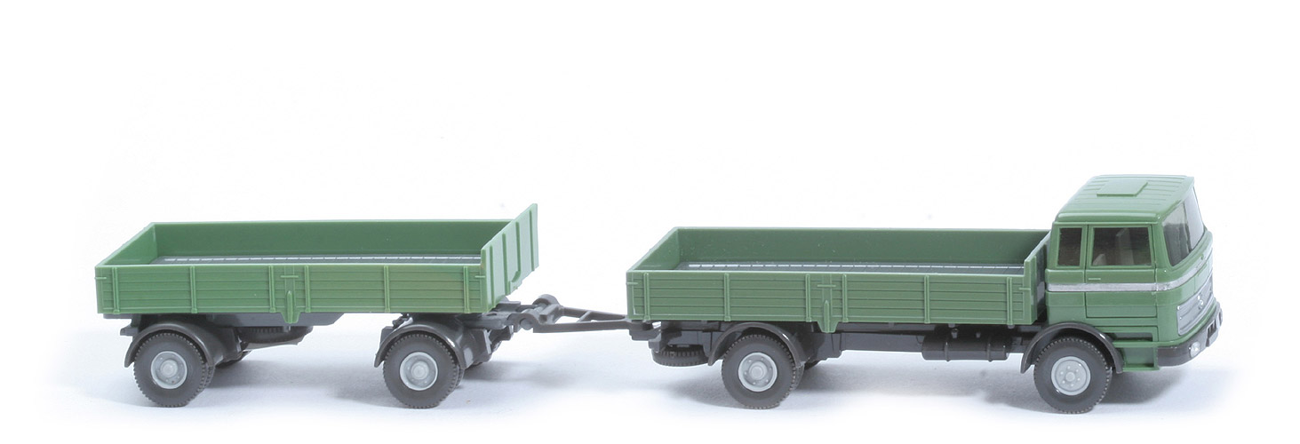 | Kabine oben | dunkelmaigrün | | Kabine unten | dunkelmaigrün | | Streifen | mit | | Verglasung | getönt | | Inneneinrichtung | ca. lichtgrau | | Lenkrad | ohne | | Stoßstange, Radlauf vorn | anthrazit | | hier Aussparung | mit | | Chassistyp | Zughaken verstärkt | | Chassisfarbe | anthrazit | | Radlauf hinten | anthrazit | | Reserverad | geklebt | | Pritsche | dunkelmaigrün | | Pritschengestell | anthrazit | | Pritscheneinlage | silber | | Plane | hier ohne | | Räder | 12mm, Profil fein | | Felgen | silbergrau |
