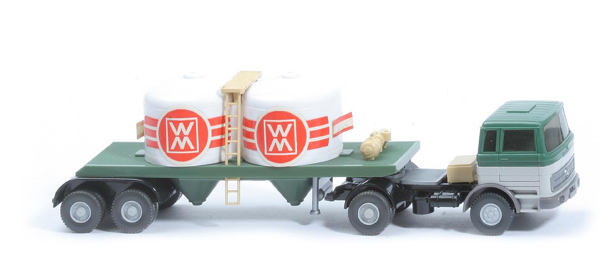 | Zugmaschine | Kabine oben | diamantgrün | Kabine unten | lichtgrau | Streifen | ohne | Verglasung | getönt | Inneneinrichtung | ohne | Lenkrad | ohne | Grill | silbern | Stoßstange, Radlauf vorn | basaltgrau | Chassistyp | neu | Chassisfarbe | schwarz | Radlauf hinten | schwarz | Reserverad | ohne | Sattelpfanne | für großen Königsbolzen | Räder | 12mm, Profil grob | Felgen | silbergrau | | Auflieger | Tanks | weiß | Basis | diamantgrün | Leitern Pumpeinheit | hellbeige | Achseinheit | schwarz | Stütze | silber | Reserverad | ohne (!) | Beschriftung | WM (s. Foto) | Räder | 12mm, Profil grob | Felgen | silbergrau | Art der Beschriftung | Papier-Aufkleber |