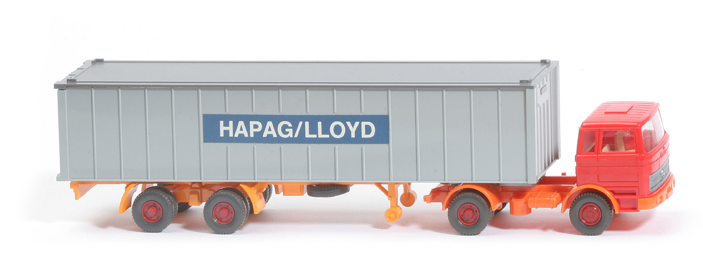 | Zugmaschine | Kabine oben | orangerot | Kabine unten | orangerot | Streifen | ohne | Verglasung | klar | Inneneinrichtung | ca. hellelfenbein | Lenkrad | ohne | Grill | silbern | Stoßstange, Radlauf vorn | orange | Chassistyp | neu | Chassisfarbe | orange | Radlauf hinten | orange | Reserverad | ohne | Sattelpfanne | für großen Königsbolzen | Räder | 12mm, Profil grob | Felgen | hellbraunrot | | Container | Art | 1 x 40 ft gerippt | Dach | basaltgrau | Korpus | silbergrau | Türen | silbergrau | Unterkante | schmal | Beschriftung | Hapag-Lloyd (s. Foto) | Beschriftung Grösse | 7 Felder, Papieraufkleber | | Auflieger | Farbe | gelborange (Werbe) | Unterfahrschutz | ohne | Königsbolzen | stark | Räder | 12mm, Profil grob | Felgen | hellbraunrot |