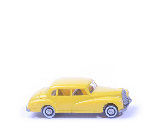 Farbe Karosserie | gelb | Scheinwerfer | klar transparent, eingesetzt | Nebelscheinwerfer | verchromt, Teil der Stoßstange | Grill | verchromt, mit Stern | Verglasung | klar | Inneneinrichtung | ca. ockerbraun, Lkr separiert | Stoßstangen | verchromt | Chassis Farbe | silbern | Bodenprägung | ohne (!) | Räder Art | MB-Radkappen, Weißwand | Felgen | gesilbert |