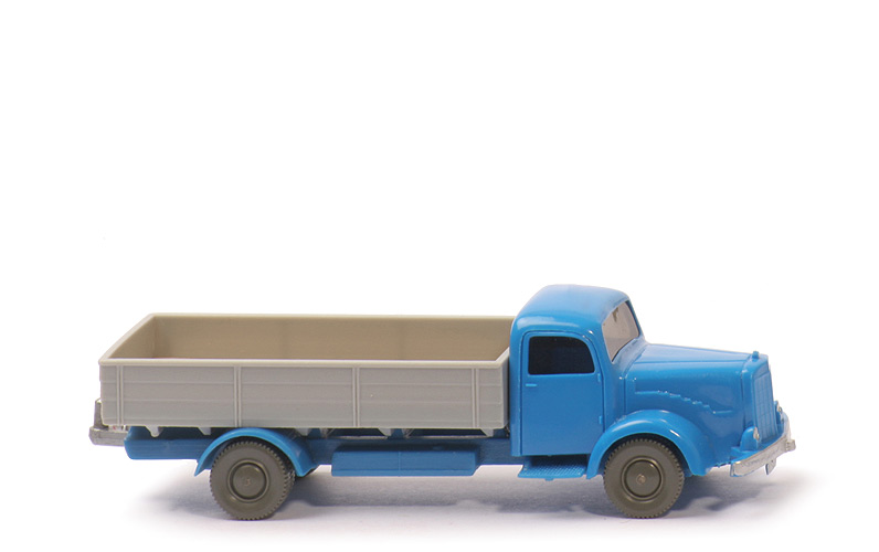 Farbe Kabine | himmelblau | Version Kabine | mit Schlitz hinter Nrn-Schild | Blinker | ohne | Verglasung | getönt | Bemalung | Scheinwerfer, Stoßstange | Chassis Farbe | himmelblau | Chassis Art | Version 1c | Achshalterungen | geschlossen | Chassis Bodenprägung | WM im Kreis | Zughaken | silbern, im Kipperschlitz | Rückleuchten am Chassis | ohne | Pritsche Art | Normpritsche | Pritschenseiten | waagerechte Gravuren | Rückleuchten | eingerückt | Kennzeichen | zweiteilig | Pritsche Farbe | silbergrau | Pritscheneinlage | beige | Bemalung Rückleuchten | rot | Bemalung Kennzeichen | ohne | Räder | 10 mm, neuere Version |