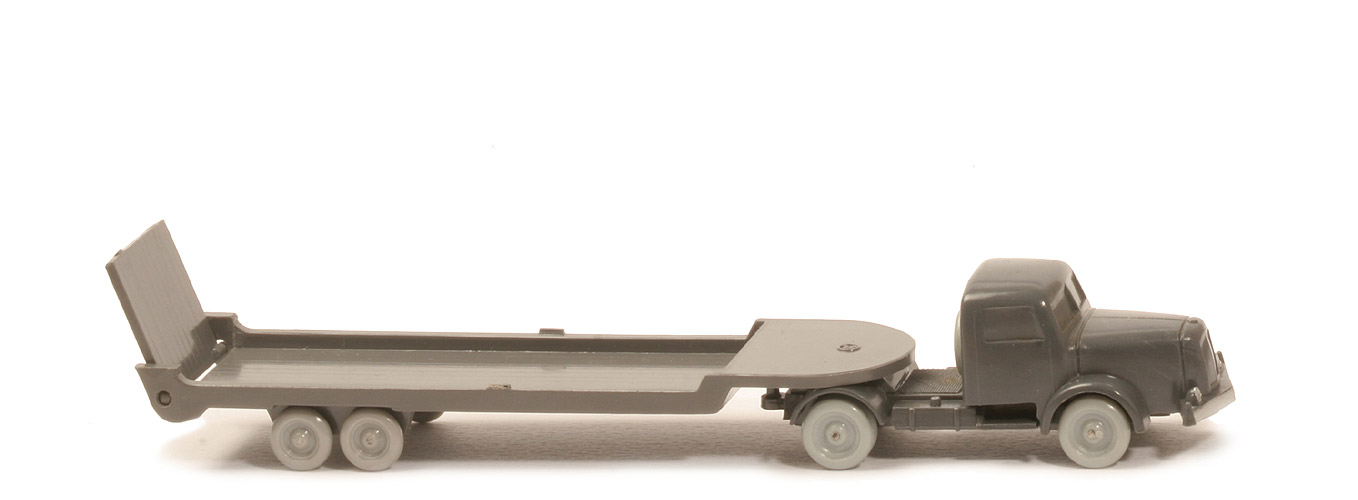 Achsen | Rollachser | | Zugmaschine | Farbe Kabine | dunkelbasaltgrau | Farbe Chassis | dunkelbasaltgrau | Bemalung | Scheinwerfer, Stoßstange | Sattelpfanne | eingesetzt, in Chassisfarbe | Chassis | Version 1a | Achshalterungen | geschlossen | Bodenprägung | WM im Kreis | Reserverad | hinter Kabine | Räder | sog. Porzellanräder | | Auflieger | Achsen | Rollachser | Farbe | betongrau | Typ | vorn rund (Typ 1) | Seilwinde | ohne | Fläche über Drehschemel | mit Prägung WM im Kreis | Rückleuchten | ohne | Rampe | kurz | Stützen | ohne | Bodenprägung | ohne | Königsbolzen | kurz | Räder | sog. Porzellanräder |