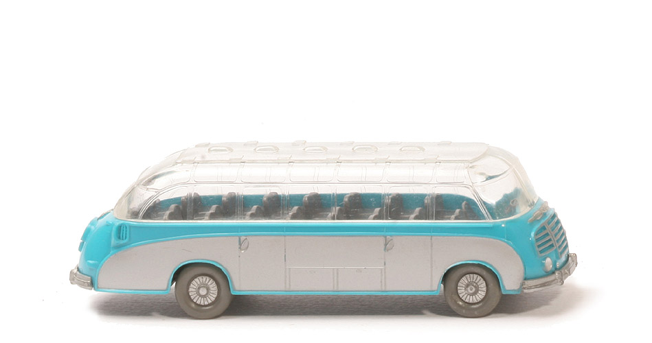 Karosserie Typ | Serie | Karosserie Farbe | dunkeladriablau | Schlitze für Dach | lang und breit | Armaturenbrett | trapezförmig | Gestaltung Zierline Front | mit Punkt, gesilbert | Boden Fahrgastraum | glatt | Gestaltung Seite | Schablonierung silber | Fahrersitz Farbe | basaltgrau | Sitzreihen | basaltgrau, gesteckt | Fahrer | ohne Fahrer | Lenkrad Typ | groß, zwei Speichen | Lenkrad Farbe | ca. basaltgrau | Dach Befestigung | geklebt | Dach Gestaltung oben | glatt, ohne Schablonierung | Dach Typ Haltenasen | lang und breit | Chassis Farbe | basaltgrau | Chassis Typ | Typ 2 | Achshalterungen hierbei | geschlossen | Bodenprägung hierbei | WM im Kreis | Bemalung Hauptscheinwerfer | silber | Bemalung Nebelscheinwerfer | silber | Bemalung Grill und Zierlinie | silber | Bemalung Stoßstangen | silber | Bemalung Rückleuchten | rot | Bemalung Blinker hinten | rot | Bemalung Kennzeichen hinten | silber | Bemalung 3 Zierlinien hinten | silber | Bemalung Lüfter | ohne | Räder Typ | Trilex Bus, ohne Profil | Räder Ausführung | staubgrau, Felgen gesilbert |