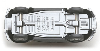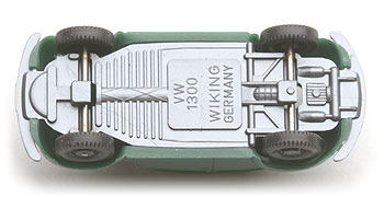 Das sehr schöne detaillierte neu entwickelte Chassis mit Stoßstangenhörnern. Typisch für diese Neuauflage des VW 1200: das neue Wiking-Logo. In der zweiten Version Prägung nur zusätzlich GERMANY und im Mittelteil verändert.