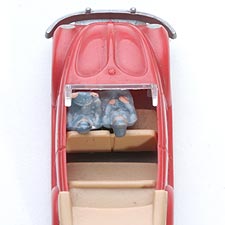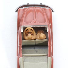 Bei der frühen Cabrio-Version war das Lenkrad mit dem Fahrer vergossen. Die Personen sind recht klein. Die Beifahrerin trägt ein Kopftuch mit begünstigendem cw-Wert.