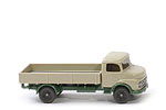 Bei der zweiten Chassis-Version des MB 1413 gab es stegartige Abstützung der Prtische. Das Reserverad wird durch diese Stege gehalten. Der hintere Kotflügel ist dicker.Die Pritsche 1 hat eine gröbere nach unten abgestufte Struktur, an der Unterseite gibt es 4 grade Quertraversen und am Heck einen schrägen Abschluss. zurück |