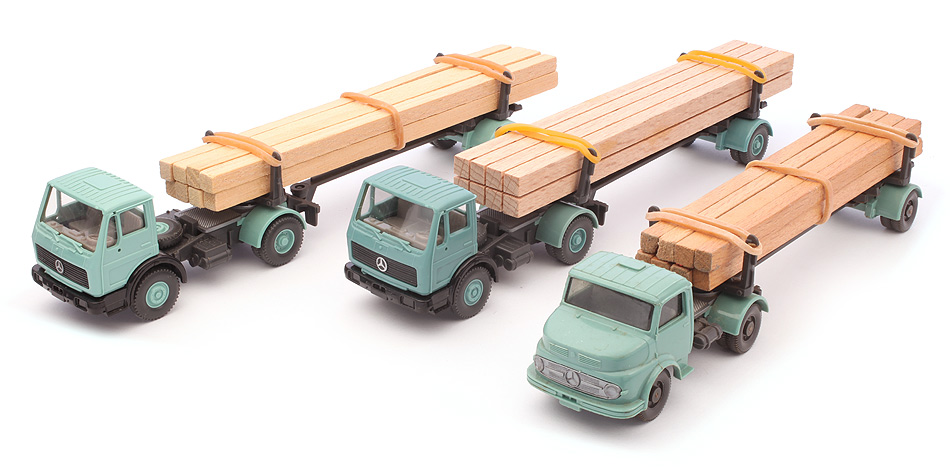 Türkis ./. Dunkeltürkis - Messemodell MB 1617 mit Holz-Monoblock neben Serienmodellen in Türkis mit Einzelhölzern. schaue auch nach "Langholz" in anderen Galeriebildern11.03.2018  >xl