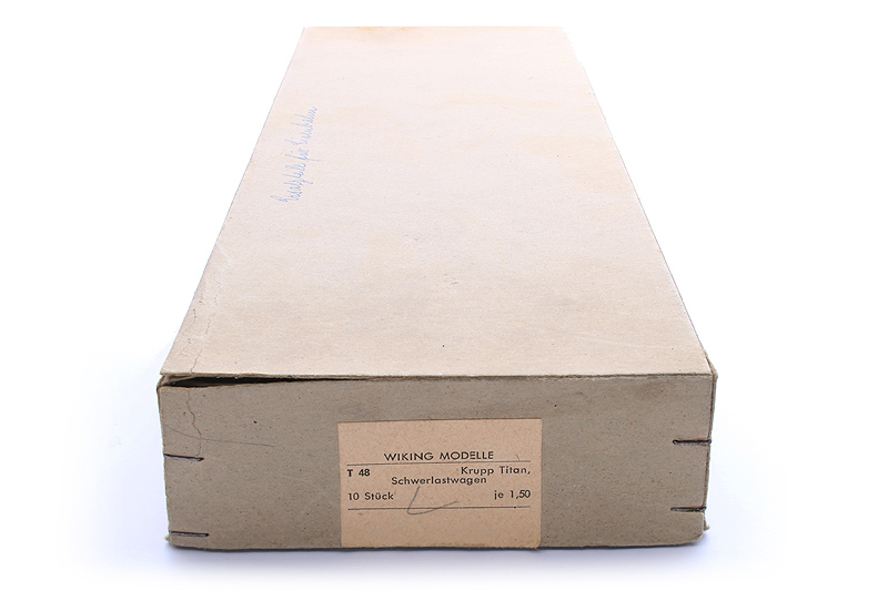 Früher Karton mit Modellen mit langen Peilstangen. Die Nummer "T 48" gab es nur bis 1956. Danach "48". Die Modellbezeichnung "Schwerlastwagen Krupp Titan" gab es in den Bildpreislisten nur 1955. 1956 hieß es "Schwerlastwagen Krupp Titan Titan 8 to mit Verdeck".