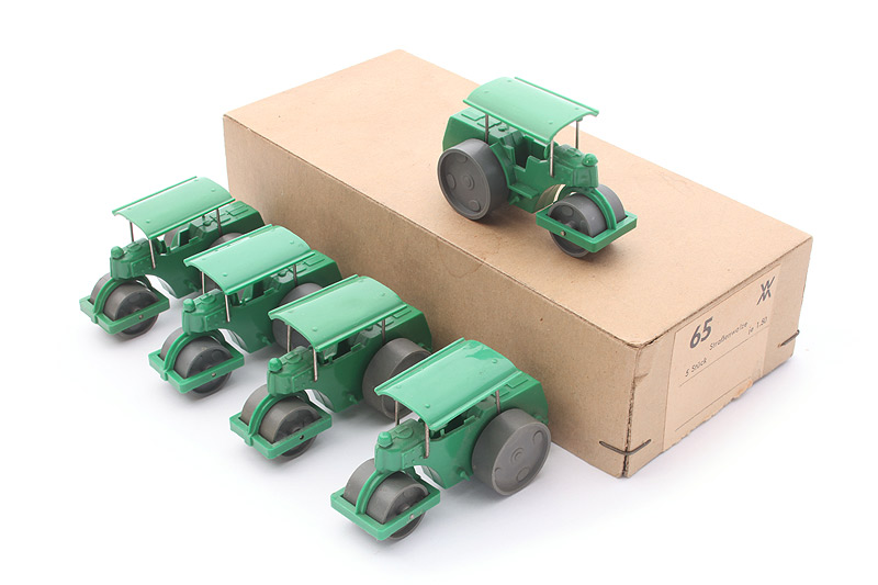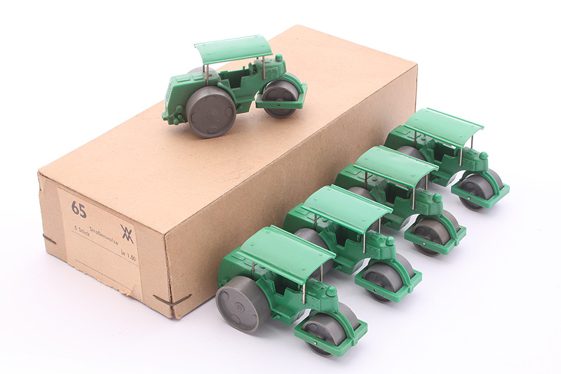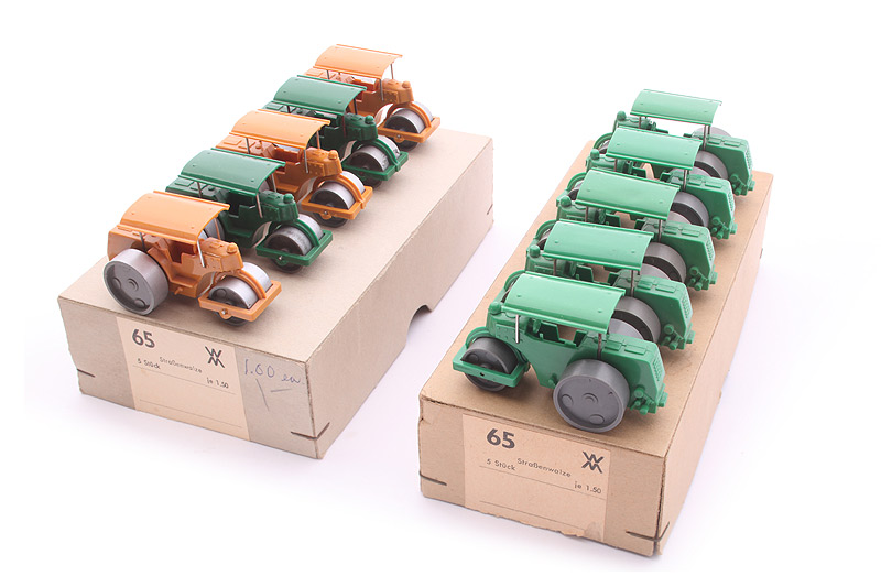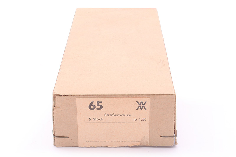 Bemerkungen: Nach "T 65" in den Jahren 1955 und 1956 folgte dann "65" bis 1973. Den Preis von DM 1,50 gab es bis 1971. Die Befüllung mit Modellen mit Dach gehört ohne Verstärkung des Achshalterung in die Jahre 1955 bis 1958. Da hier WM ohne Kreis kommt als Verkaufsjahr nur 1958 in Frage. Auf dem letzten Bild gibt es es einen weiteren Walzenkarton mit etwas späteren Modellen. |