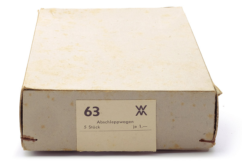 Bemerkungen: Die Bezeichnung "Abschleppwagen" wie auf diesem Karton gab es in der Bildpreisliste nur bis 1958 und nur bei den unverglasten Modellen (danach: "FW-Abschleppwagen"). Da es die Kartons mit WM ohne Kreis ab 1958 gab, ist dieser Karton wohl auf 1958 zu datieren. |