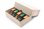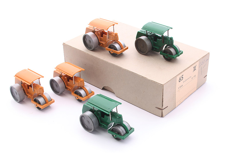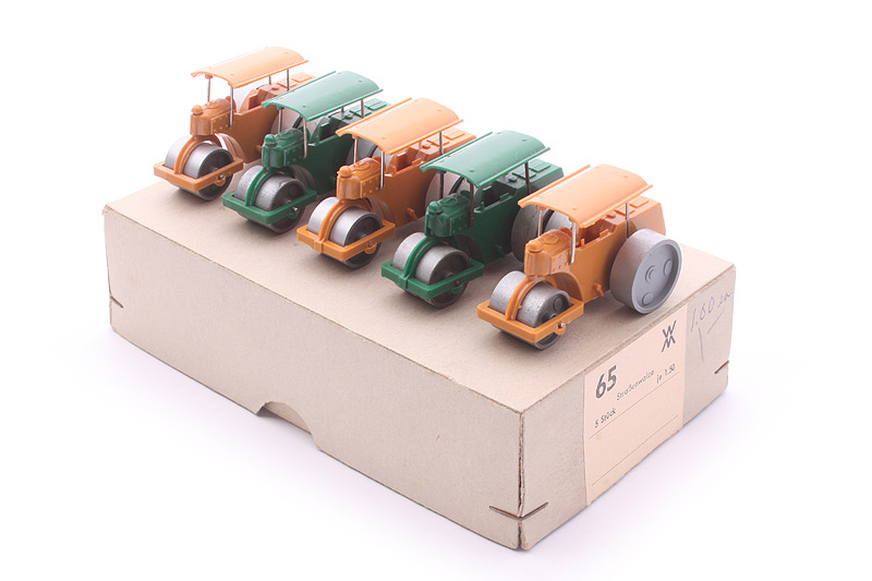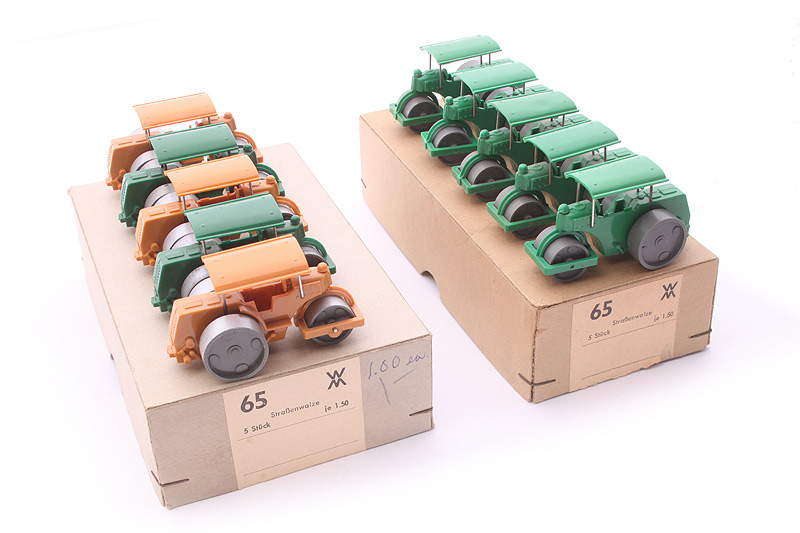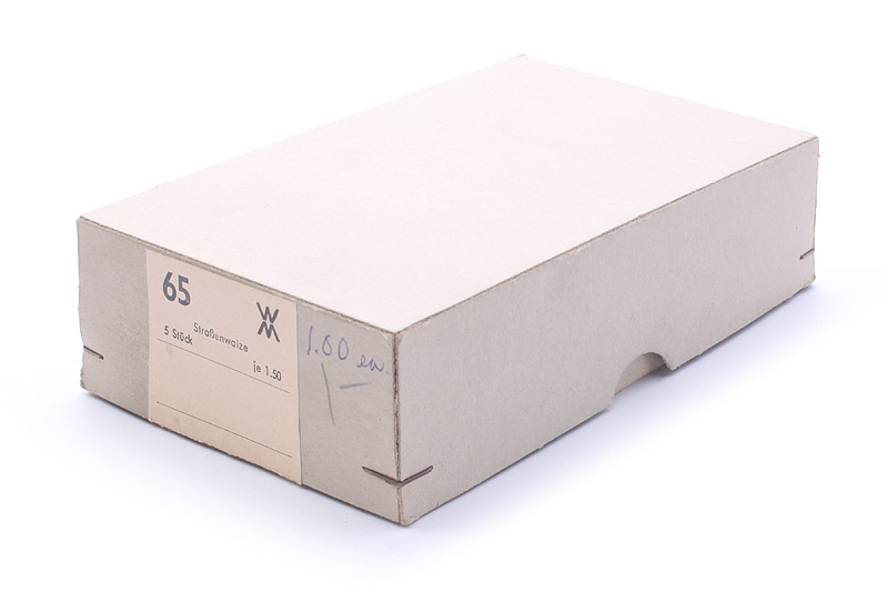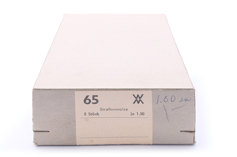 Bemerkungen: Nach "T 65" in den Jahren 1955 und 1956 folgte dann "65" bis 1973. Den Preis von DM 1,50 gab es bis 1971. Die Befüllung mit Modellen mit Dach gehört in die Jahre von 1957 bis 1965. Ab 1966 fiel das Dach weg. Vor 1958 Karton mit WM im Kreis. Hier bestückt mit Modellen in senfgelb und laubgrün mit Verstärkung der Vorderachse. Auf dem letzten Bild ein früherer Karton mit 5 grünen Walzen. |
