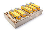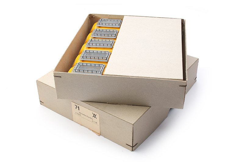 Bemerkungen: Ein besonderer original bestückter Karton im Neuzustand. Interessant: Offenbar zum Schutz der empfindlichen Gepäckbrücken wurde neben dem Wickelpapier ein Kartonstreifen eingesteckt. |
