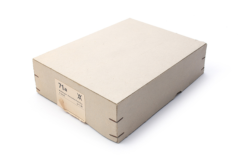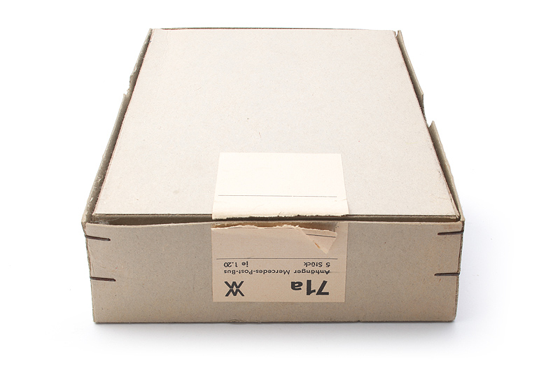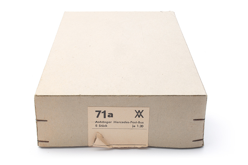 Bemerkungen: Schönes originales Ensemble im Neuzustand. Aus gleicher Quelle wie der passende Karton mit den Zugwagen - siehe Bild rechts. Da es ab 1958 die Kartons mit WM ohne Kreis gab, auf 1958 - 1960 einzuordnen. |